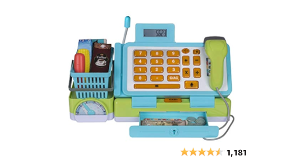 Playkidz Interactive Toy Cash Register For Kids Sounds Early Learning Play Includes Play Money Handheld Real Scanner Working Scale Calculator Live Microphone Food Boxes Plastic Fruit Basket Toys Games Amazon Com